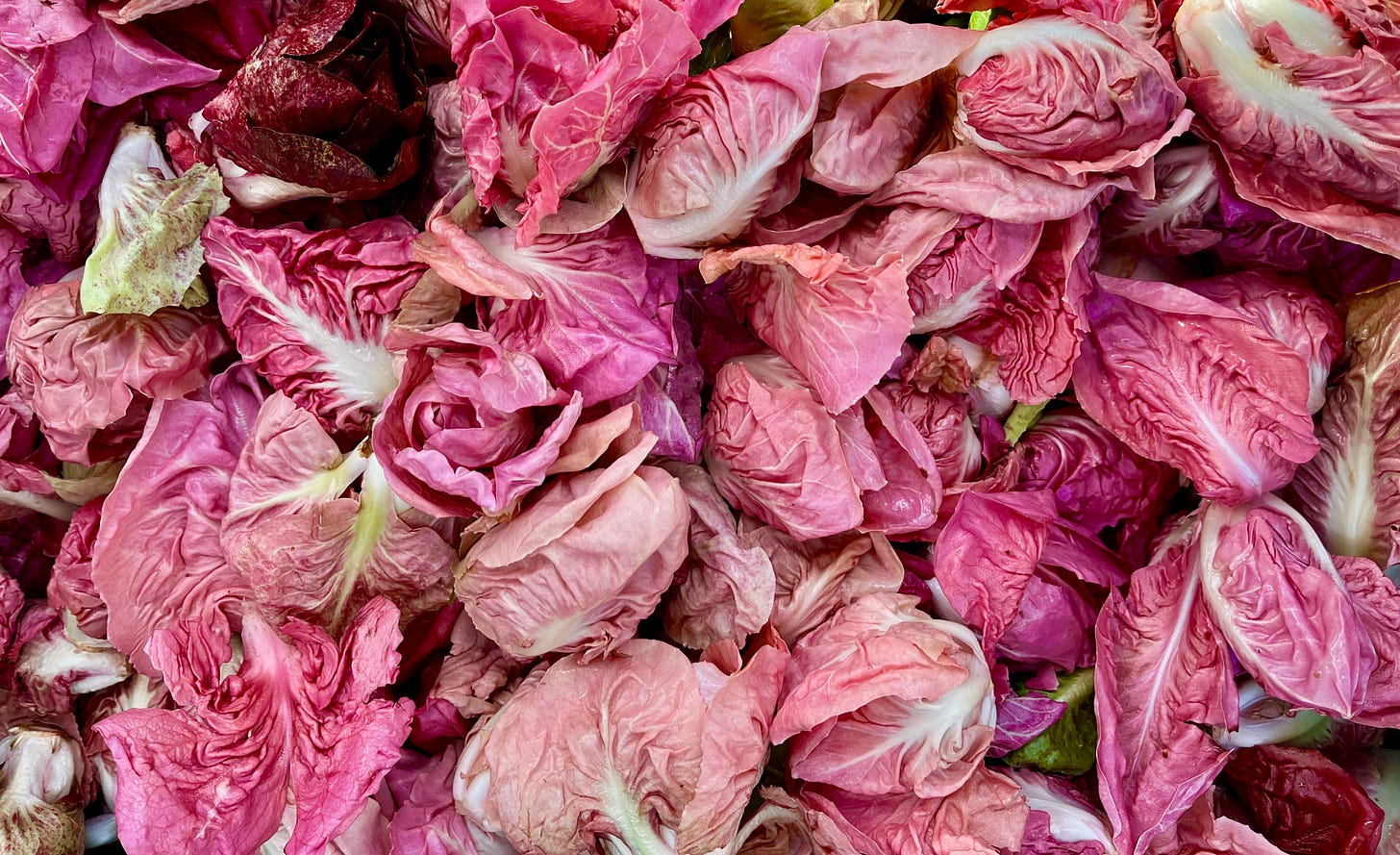 On Friday, the weather leveled out a bit to sunny and cool, and it was a perfect day to visit the farmers’ market to seek out my favorite shoulder season produce: chicories. These beautiful bitter greens are the stars of this time of year: they show up to the markets before other traditional spring produce like asparagus and ramps, and their bright pink and green hues give me the jolt of life I need to carry me to warmer weather.