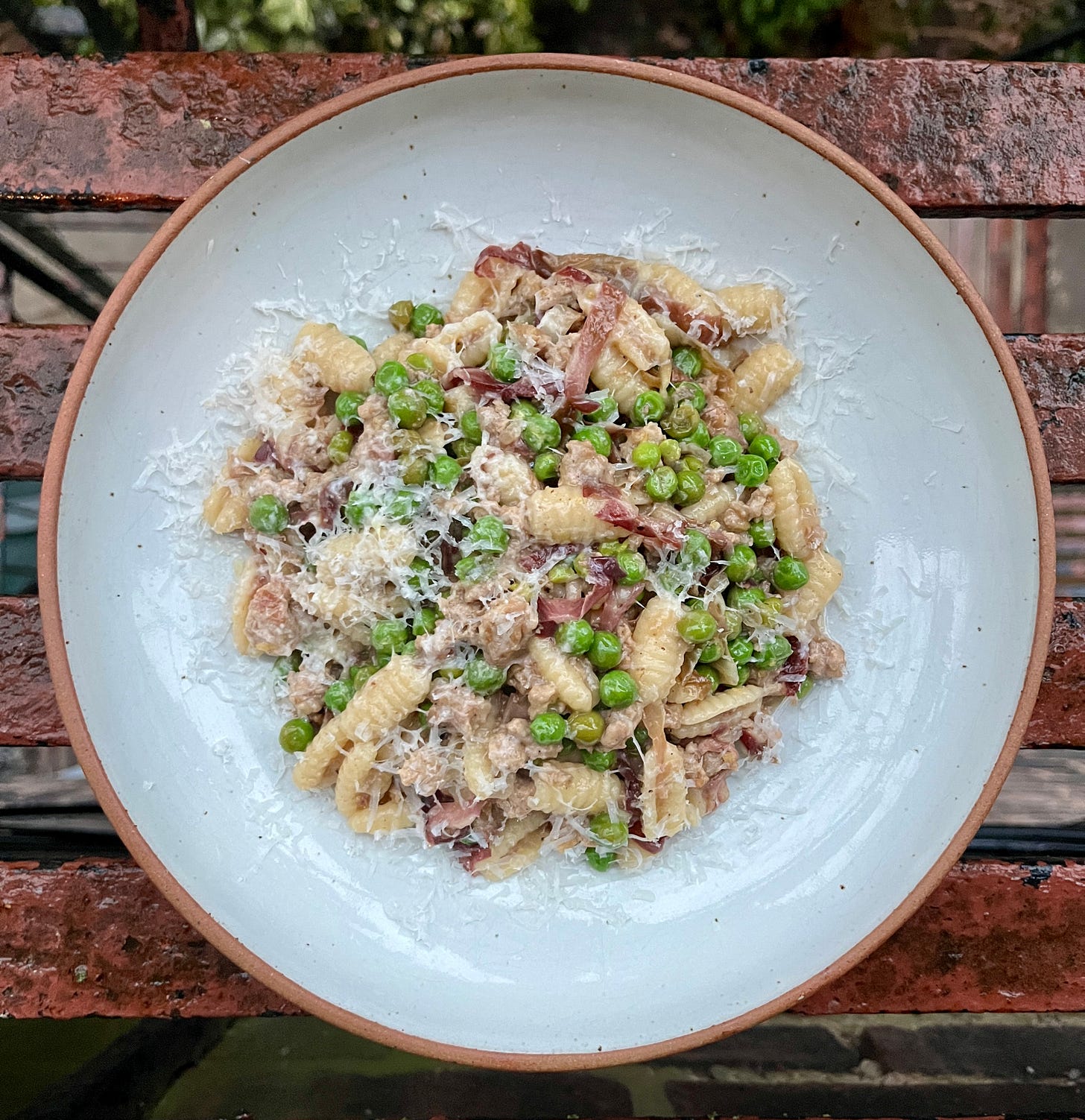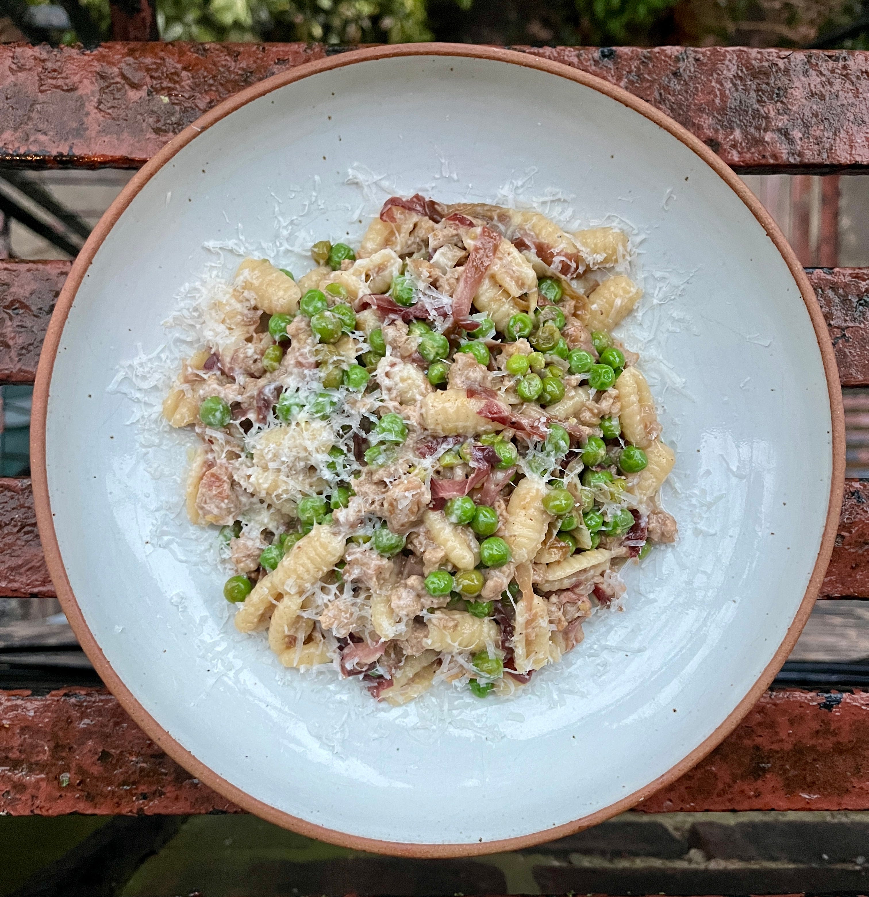 Pasta with radicchio, pork, and peas