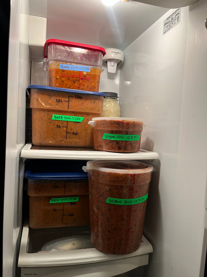 The Monday before the pop-up it was finally go time. I shopped for almost everything on Monday and Tuesday and tested the limits of storage in my fridge. On Wednesday (New Year’s Eve), I made all four batches of the vegan chili, and on New Year’s day I peeled myself off the couch around 4pm to make two batches of a meat and bean chili. Friday I made the final four batches of meat and bean chili. Throughout the week I did some other prep like making pickled onions and pickled chilies, but a lot of the toppings prep was saved for Saturday and Sunday.