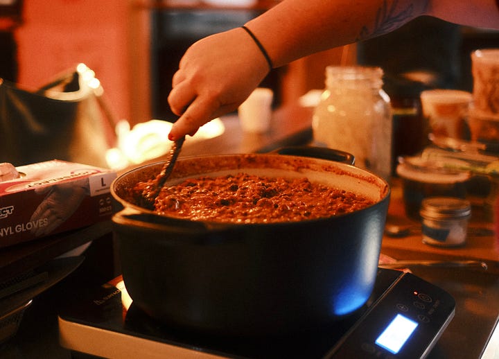 I had a lot of leftover chili which is now nicely packed away in my freezer, and so far has been given away as a thank you for a favor, brought on a ski trip, and I even think a colleague is going to buy some. About a dozen tortillas went home with my brother in exchange for the chilies, and I’ll happily eat the rest. The extra cheddar and sour cream will be used for an upcoming recipe for this newsletter, and the extra bowls and cutlery will be used for future parties and pop-ups.