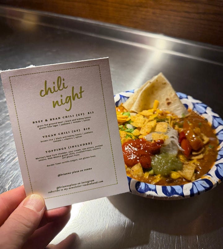 We stayed at the bar until 9:30 and I served about 22 servings of chili, a handful to people I didn’t know. One woman came in because she saw the chili posted on instagram, which was cool. I served someone at 9:30 after we’d packed up because I could tell they really wanted chili but felt bad about asking. Someone asked me about hosting a private party and another woman tried to order a negroni from me, two things I couldn’t help with.