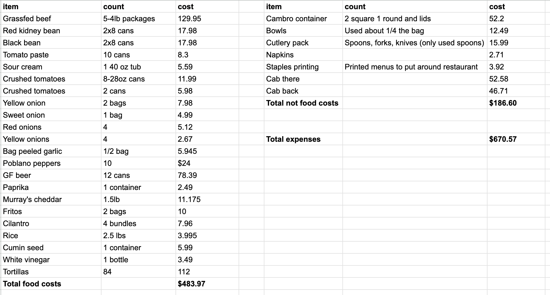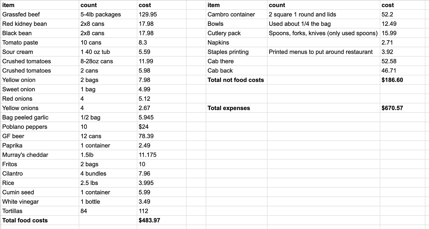 All in all, I made $305 with tips. Which if you look at my expenses, is a loss. The cost of food ingredients was ultimately not crazy because I mostly shopped in bulk at Costco, but the gluten free lager was an expensive surprise. My brother brought green chilies from New Mexico and made red chili gravy for the toppings bar. The biggest expenses were large containers to store the chili and the required cabs there and back.