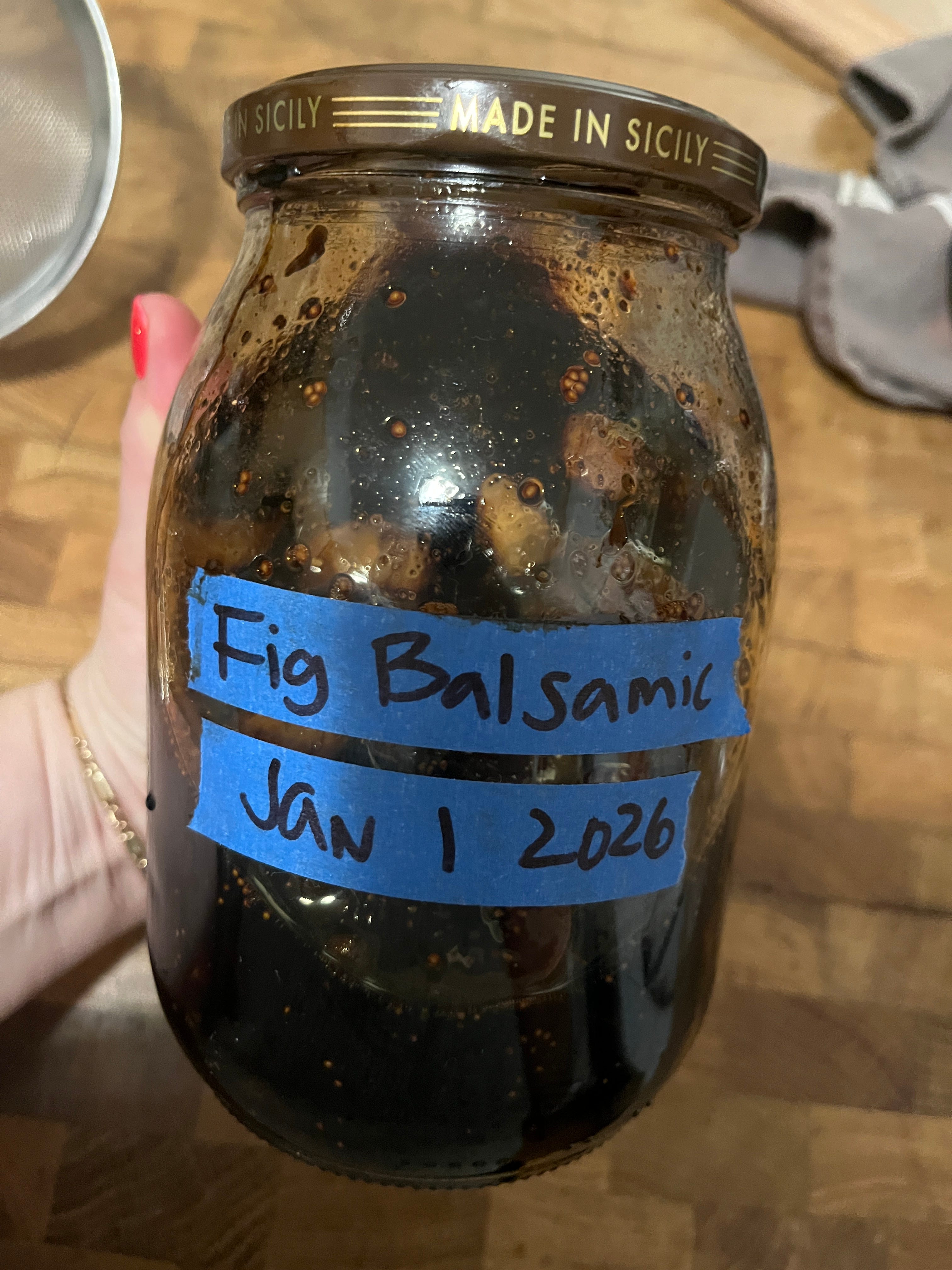 Slice the dried figs in half. Pour the balsamic in a jar, add figs, cover, and gently shake a few times. Let sit for at least a week, gently shaking the bottle a few times a day. You should go longer, but I found at about 8 days, the fig flavor really started to come through (and I was getting impatient). Taste and decide when the flavor is right to you.