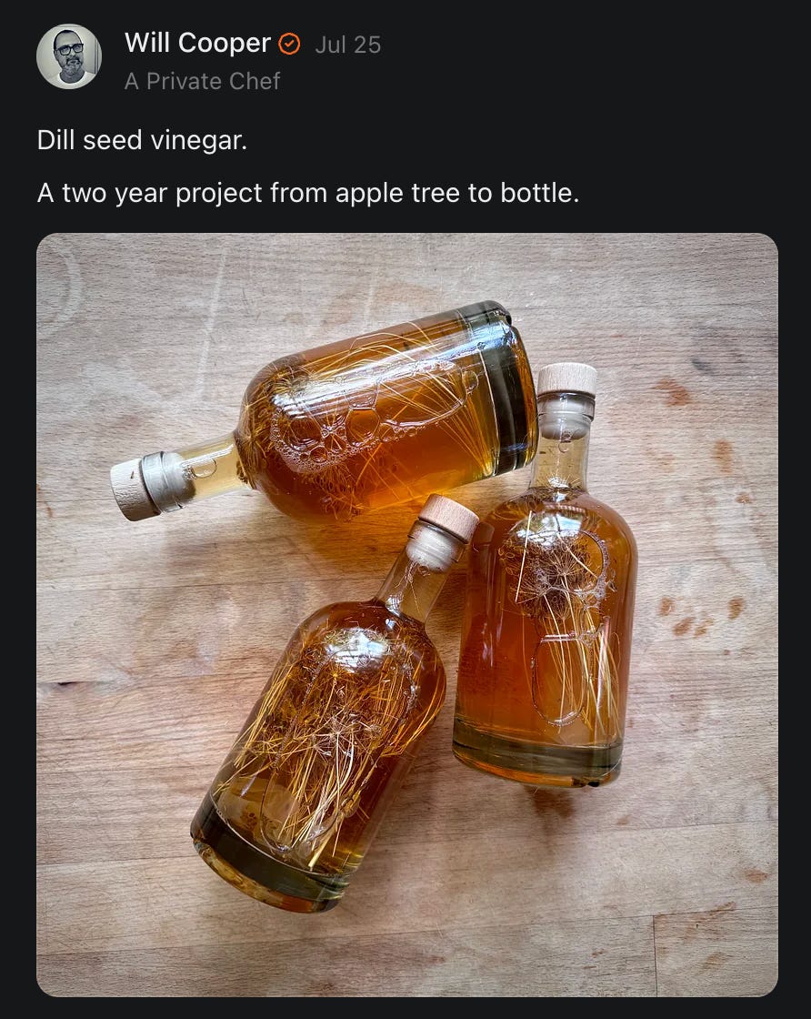 When I was thinking about this issue, I knew I wanted to reach out to Will Cooper, a private chef for an ultra high net worth family living on a sprawling estate in the English countryside. As part of their daily meals, he makes the cheeses, breads, cured meats, and vinegars from ingredients grown and raised on the property. He’s a master of flavor and I needed to know more about his vinegar making process.
