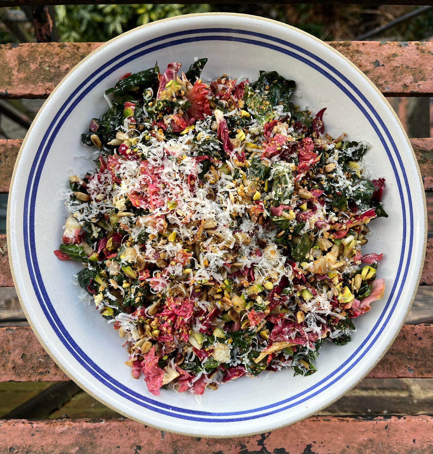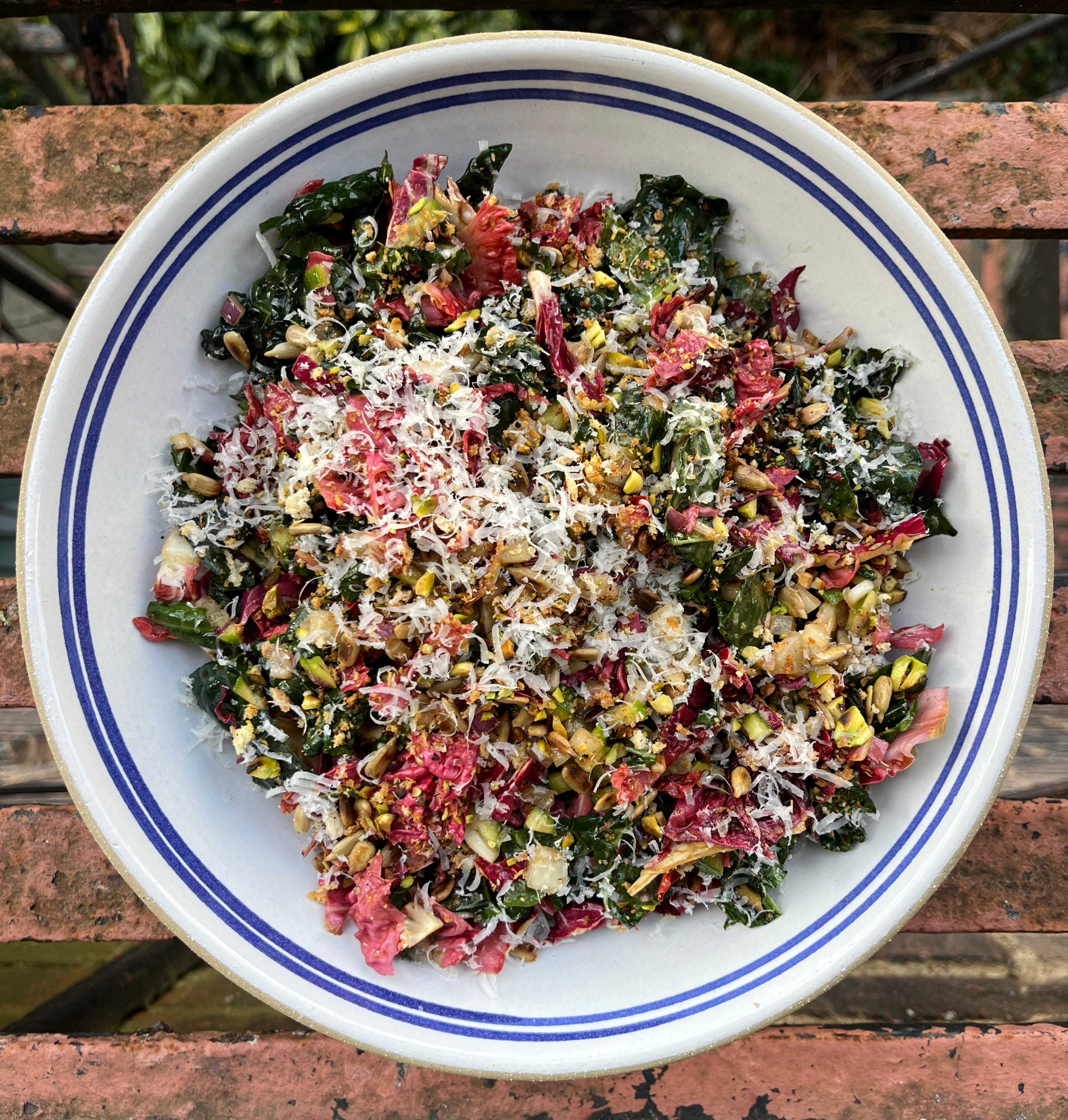 Combine the greens and onions. Starting with a little at first, toss the greens with dressing until coated and add more to your liking. I find that bitter and more robust greens need more dressing. Top with a shower of parm and crunchy salad topper.